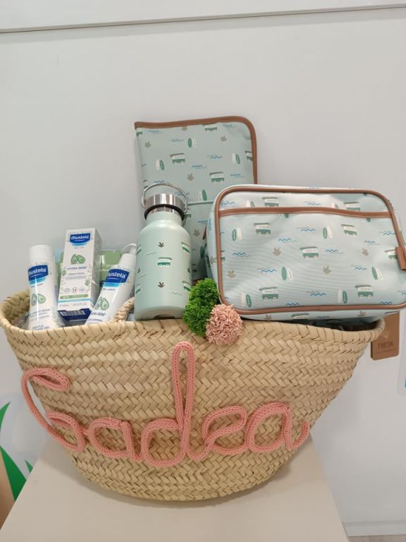 Capazo personalizado con producto de mustela, neceser, portadocumento y cambiador y botella termica